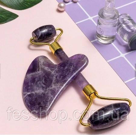 Ролик і скребок ГуаШа Аметист JADE ROLLER c фірмовою коробкою